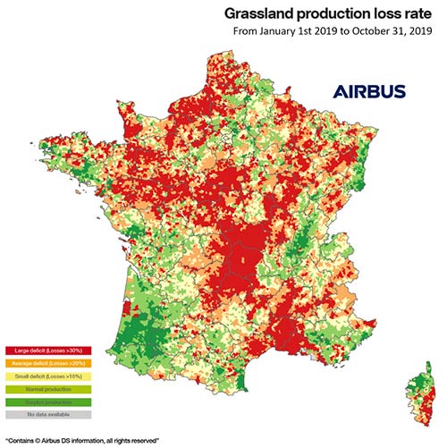 The Grassland Production Index (GPI) is a service allowing insurers to cover cattle breeders against shortages in forage yield. It features a reliable and continuous estimation of grass growth over the entire territory of France.