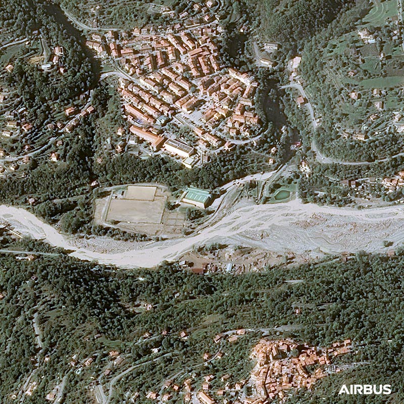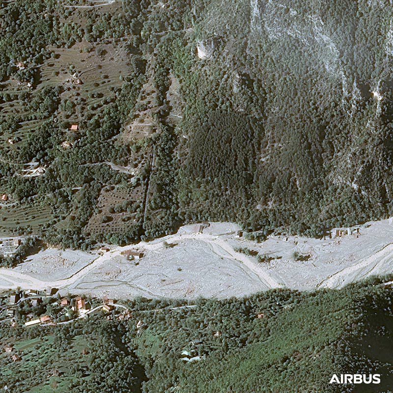 On October 2nd, 2020, storm Alex over France caused a torrential flooding of the Vesubie river devastating the banks of several cities as Roquebillière. Pléiades is involved in the International Charter for Space and Major Disasters and in the European program Copernicus Emergency.