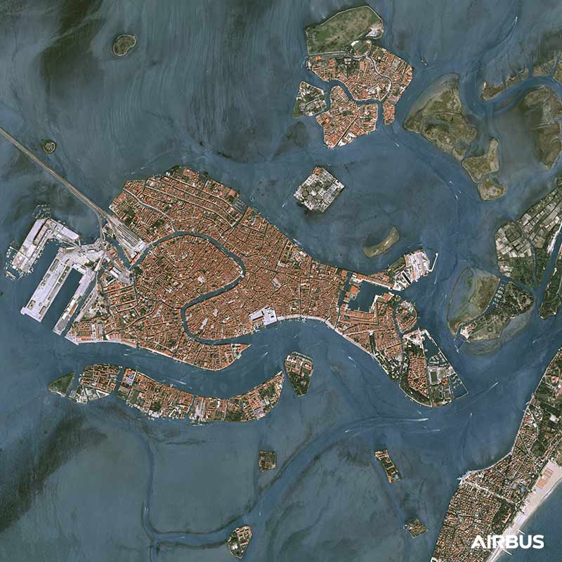 The resolution and the daily repeatability of Pléiades on the same site makes it possible to measure human activity by detecting the number of transport vehicles, planes, cars or ships, to provide economic and environmental information as here in Venice during confinement of Covid-19.